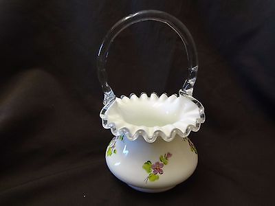 FENTON ART MILK GLASS VIOLETS IN THE SNOW BASKET SIGNED THOMAS