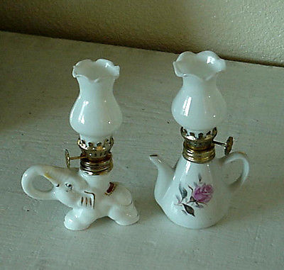 Title (ebay affiliate link): 2 Old Miniature Oil Lamps - Teapot - Elephant - Milk Glass Globes - Perfect!