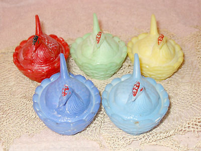 Vtg Westmoreland? 2.5" White Milk Glass 5 Mini Hen on Nest Salt Dips Red Yellow