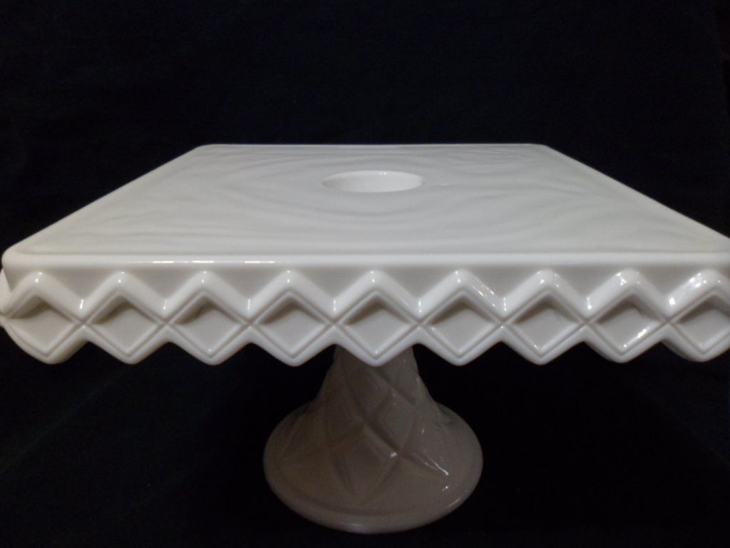 Title (ebay affiliate link): Indiana White Milk Glass Square Pedestal Cake Stand with Rum Well