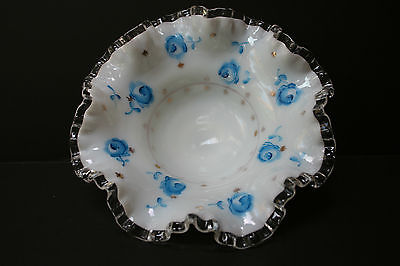 Vintage Fenton Milk Glass Silver Crest Blue Roses Bowl