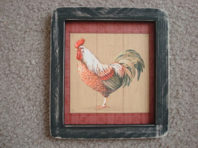 Title (ebay affiliate link): Primitive Country Mini Print *COLORFUL CHICKEN* in black frame 6 1/2" x 7"