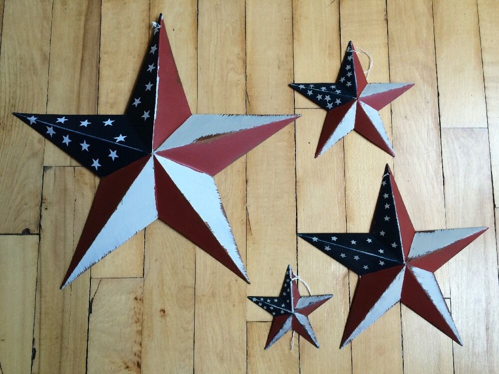 Title (ebay affiliate link): SET OF 4 AMERICANA FLAG BARN STARS 12" 8" 5" 3" PRIMITIVE PATRIOTIC FLAG RUSTIC