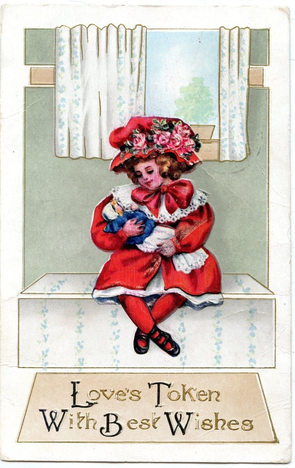 Title (ebay affiliate link): B5787 Loves Token With Best Wishes Girl Doll Antique Valentines Day Postcard Emb
