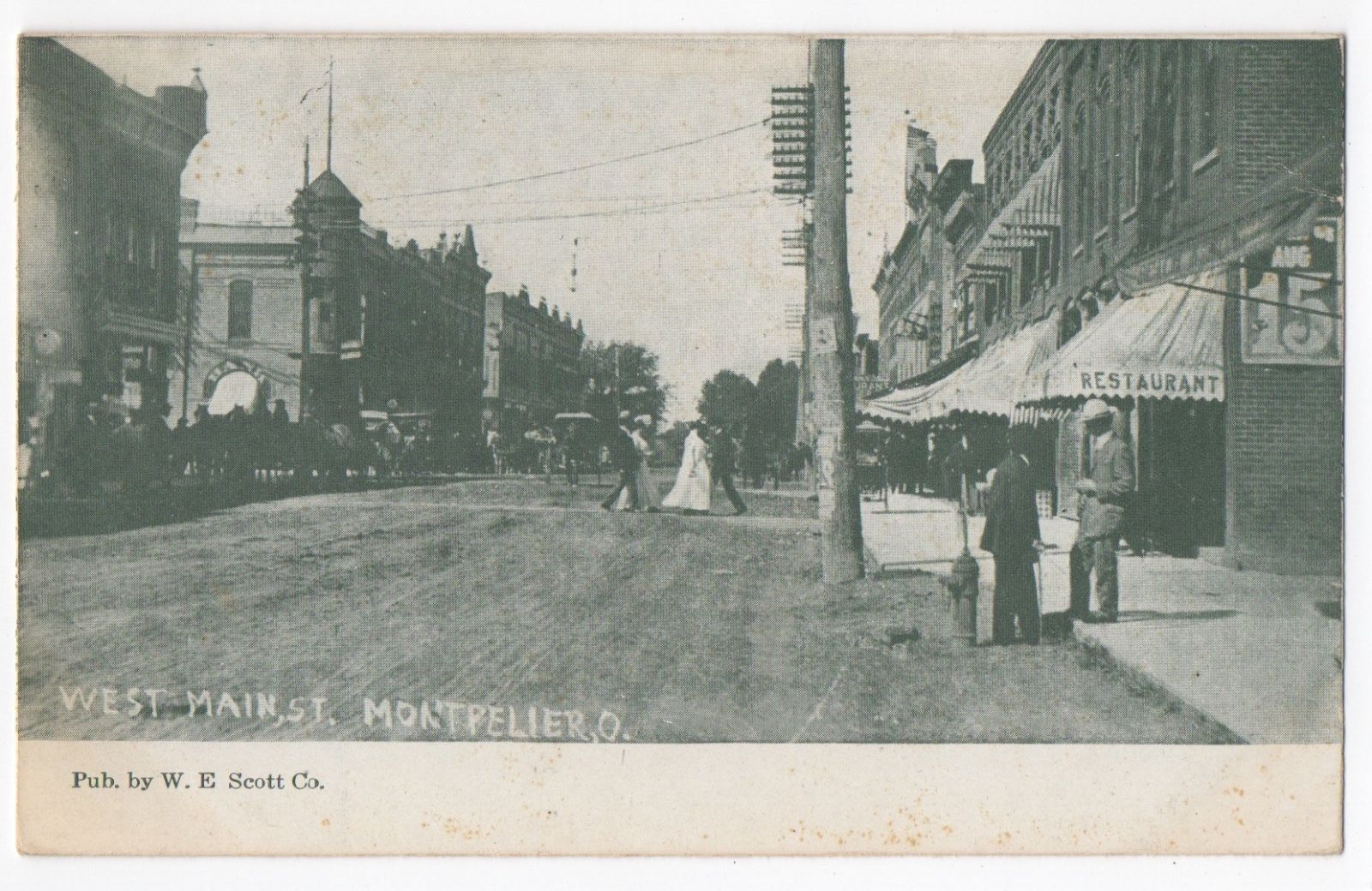 Title (ebay affiliate link): 1909~Montpelier,OH~WEST MAIN ST~BANK~RESTAURANT~Williams County,Ohio~W.E. SCOTT