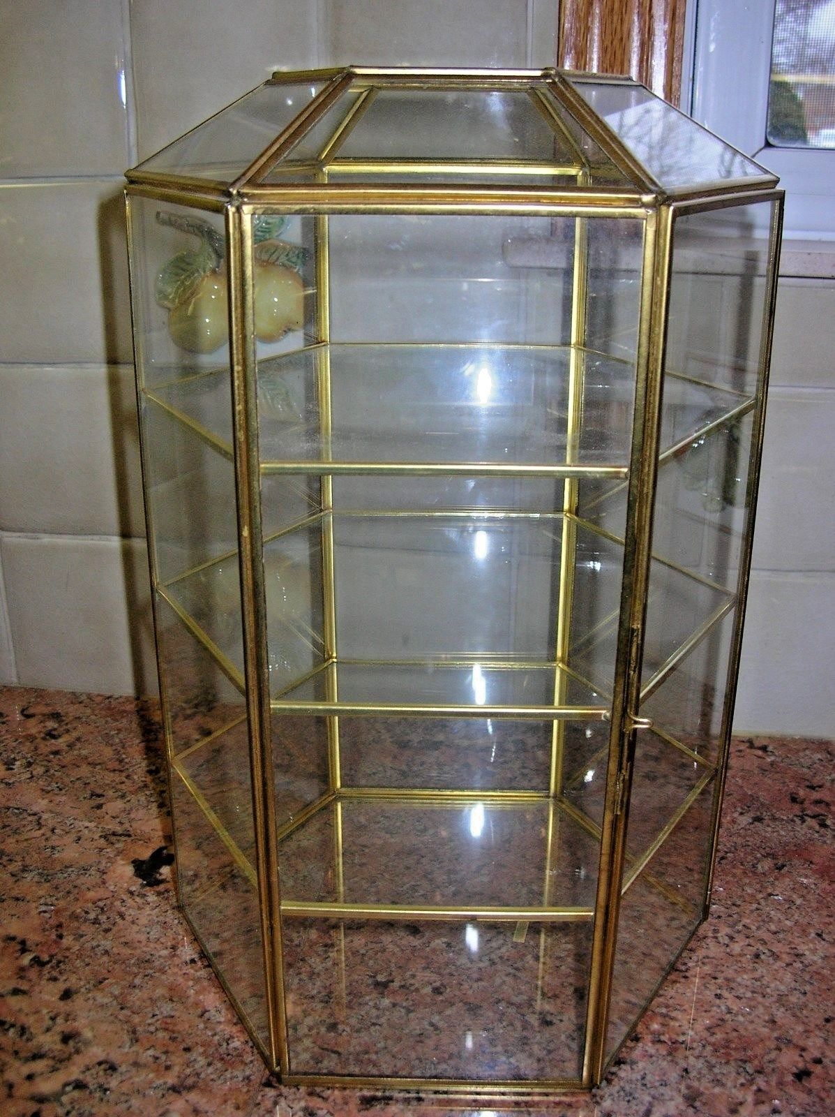 Title (ebay affiliate link): Vintage Brass & Glass Display Case Vitrine Hexagona Shelf Curio Case Miniatures
