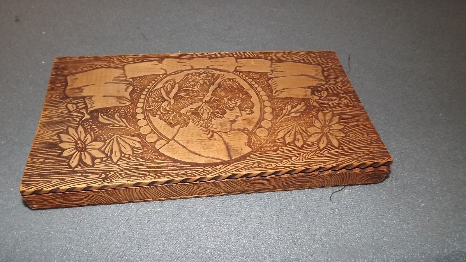 Title (ebay affiliate link): Antique vintage Wood Pyrography Handkerchief Box with Victorian Lady Nice U127A