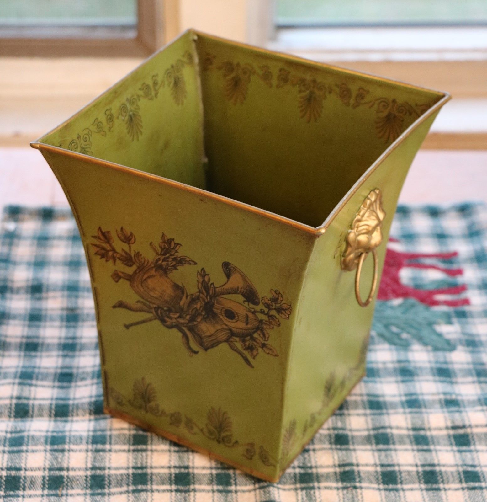 Title (ebay affiliate link): ITALY TOLE TOLEWARE PAINTED LION HEADS METAL CACHE / TRASH CAN NORA FENTON