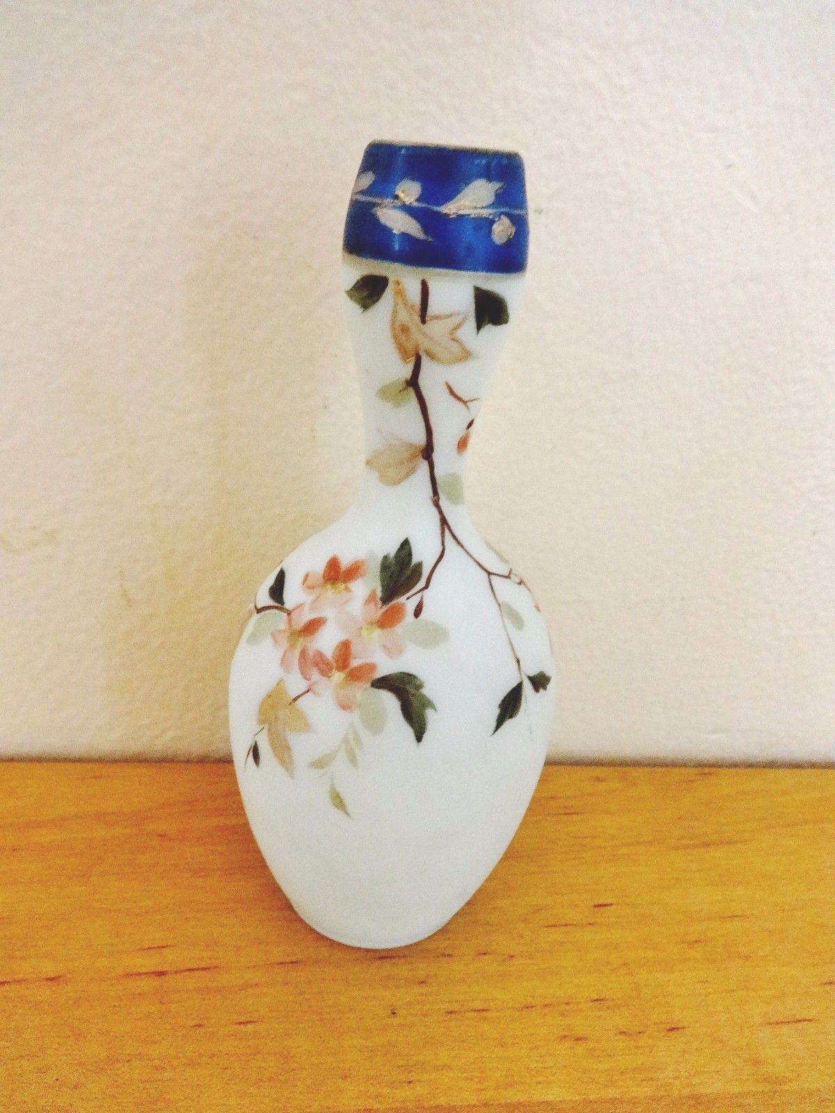 Title (ebay affiliate link): Antique Vienna Satin Glass Vase Multi-color with Cobalt Hand Painted