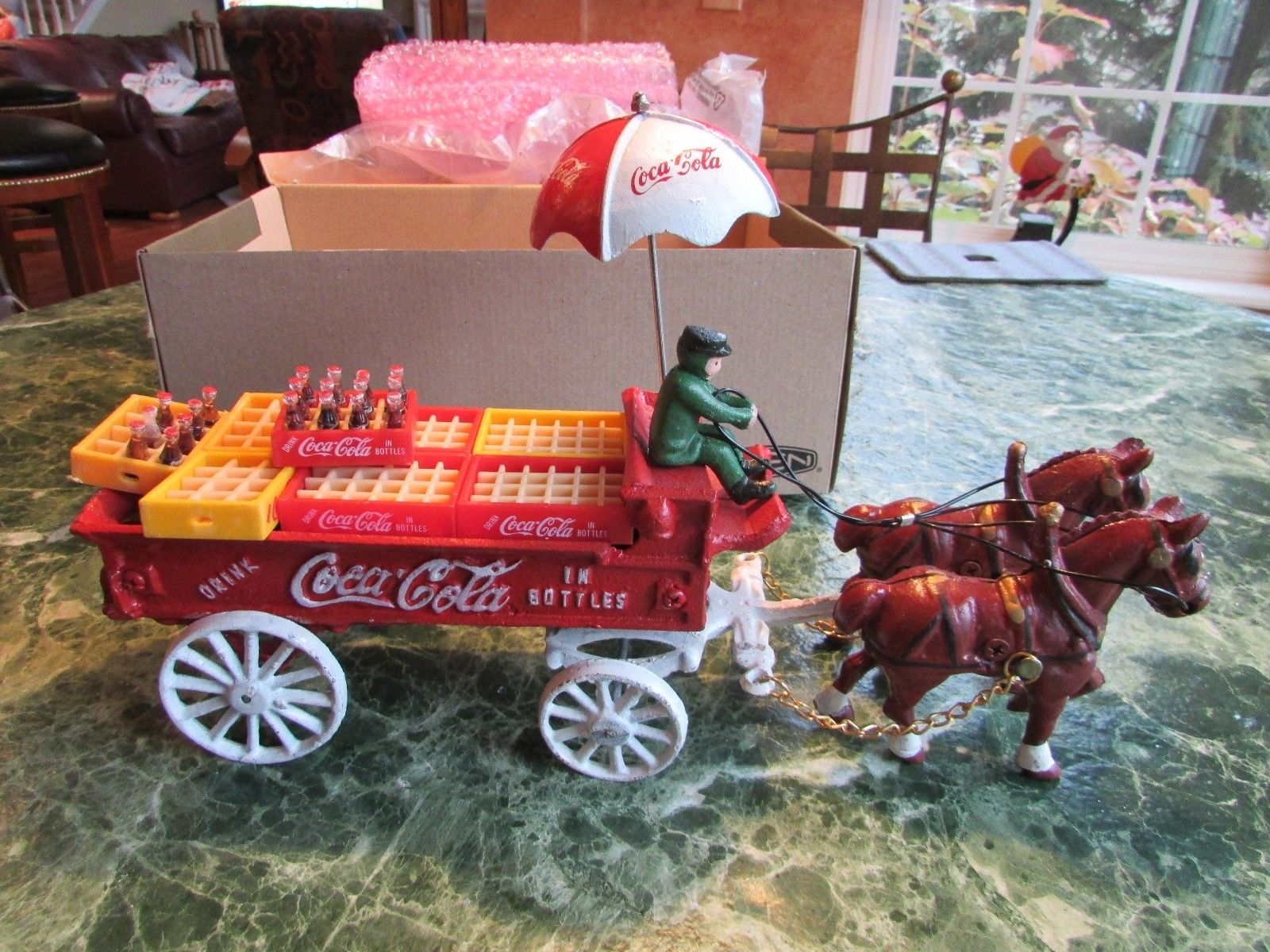 Title (ebay affiliate link): VINTAGE COCA COLA CAST IRON "HORSE DRAWN DELIVERY WAGON" w/ cases and umbrella