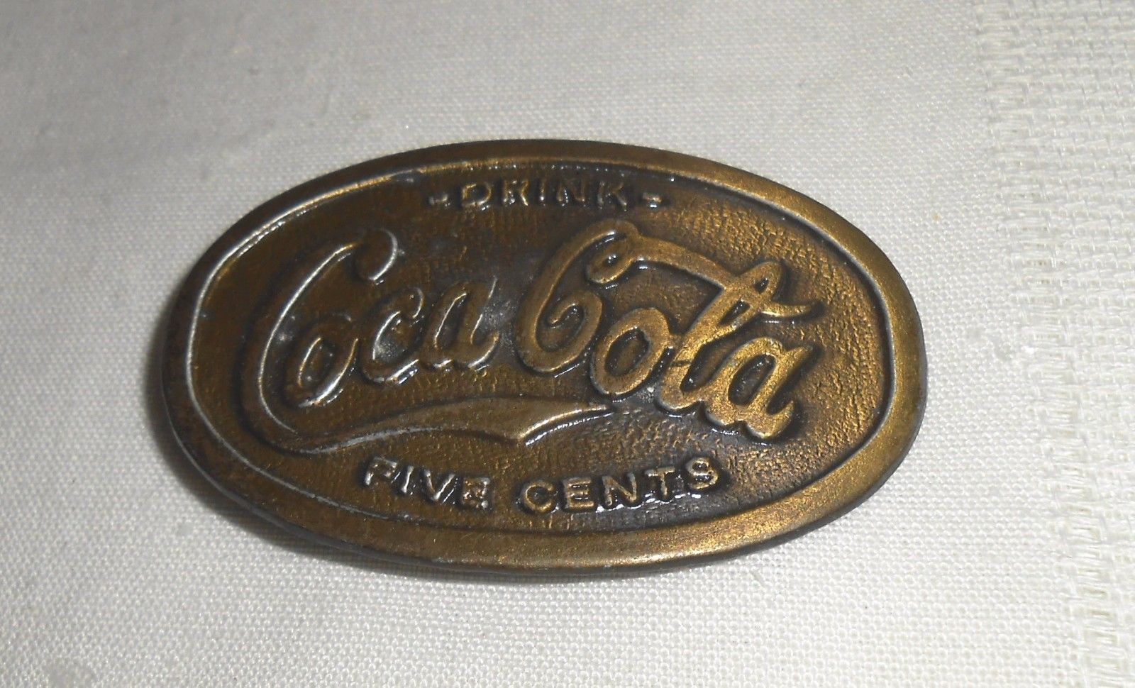 Title (ebay affiliate link): Coke Coca-Cola Oval Metal Belt Buckle "Drink Coca Cola Five Cents"