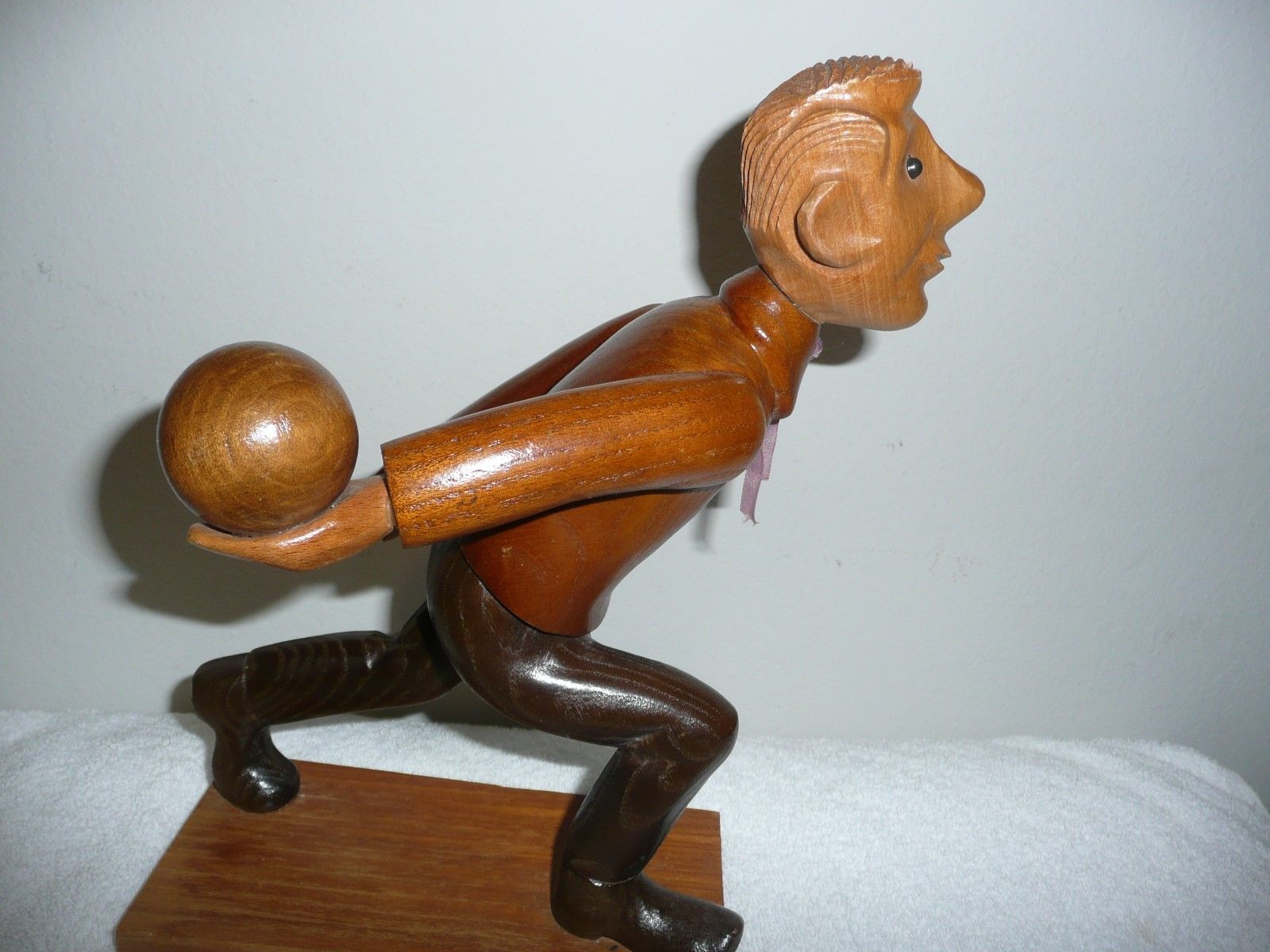 WOOD CARVED FIGURE MAN WITH BOWLING BALL APPROX.10" TALL