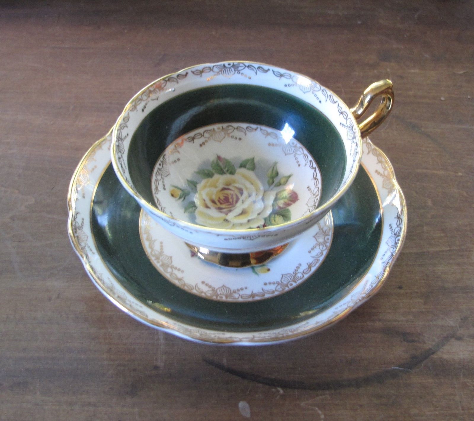 REGENCY TEA CUP AND SAUCER GREEN BAND YELLOW ENGLAND ROSE TEACUP