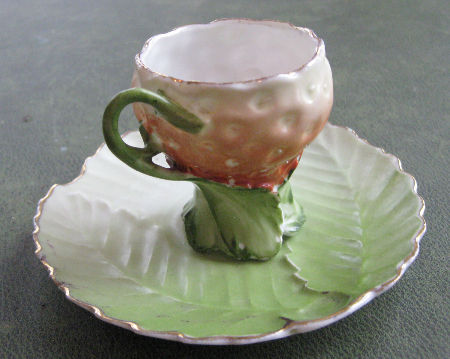 Title (ebay affiliate link): Small Antique Porcelain Tea Cup Saucer in Red Berry Green Leaf Design
