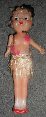 Celluloid Carnival 9" Kewpie Doll w/ Hat, Hula Skirt +