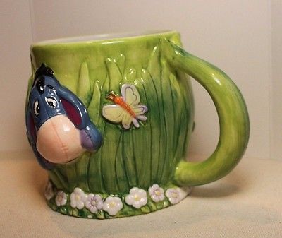Title (ebay affiliate link): Disney EEYORE Mug Raised exterior EEYORE W/ Flowered background in green