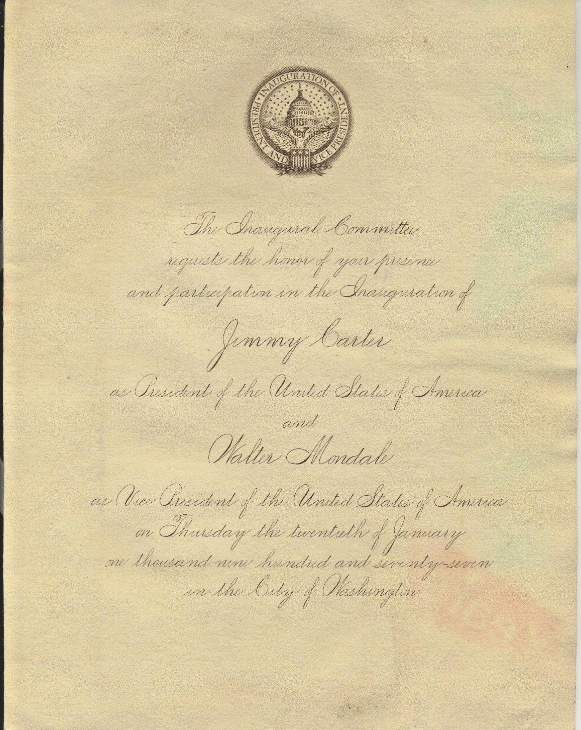 PRESIDENT JIMMY CARTER INVITATION TO INAGURATION, JAN. 20, 1977