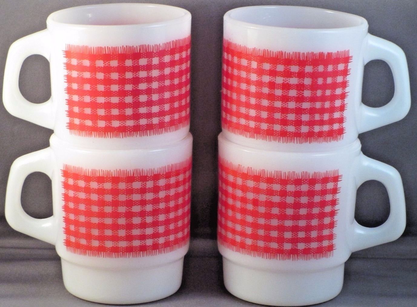 Fire King Milk Glass Mug Set 4 Red Gingham Check Decal Glossy Anchor Hocking