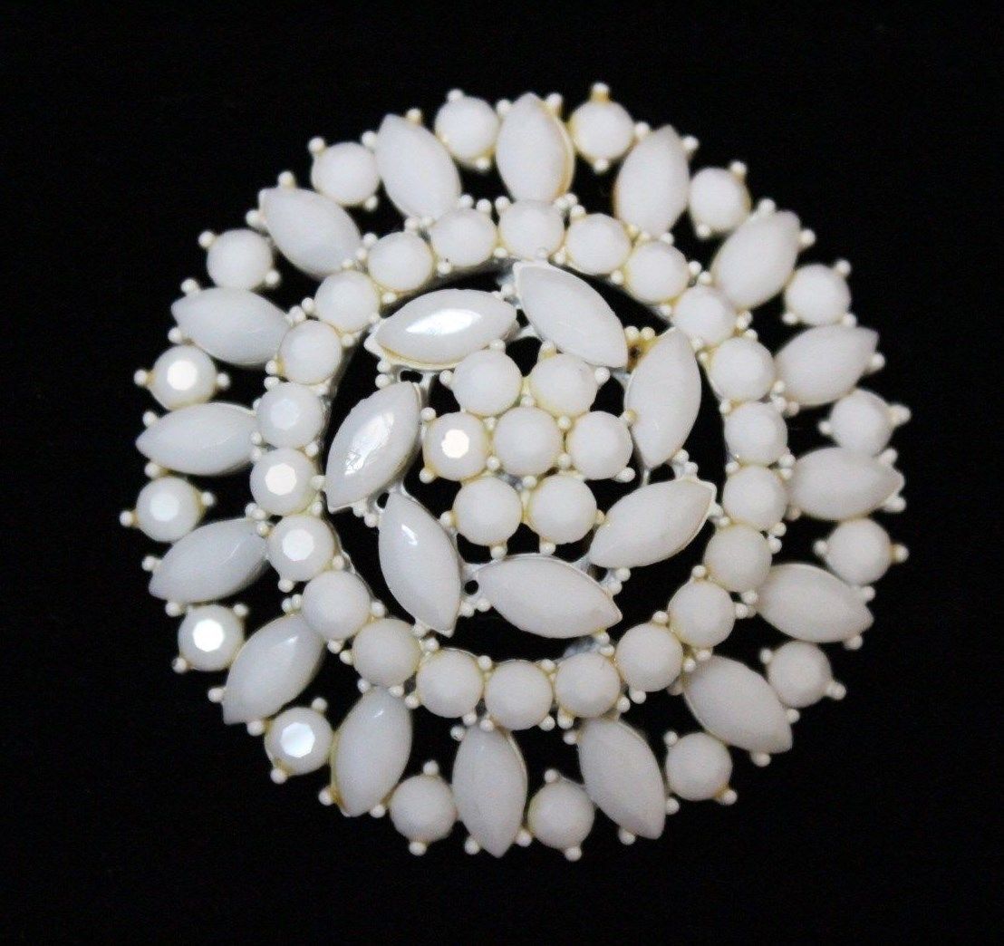Title (ebay affiliate link): Vintage Fabulous WEISS white milk glass & white Enemal Brooch Pin
