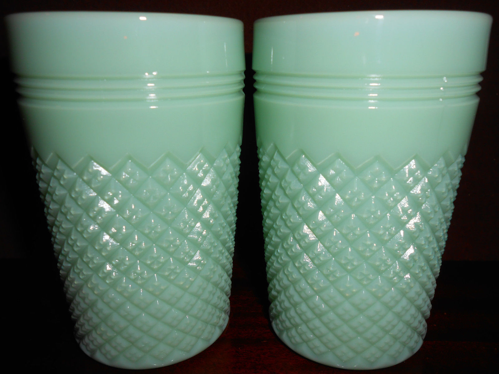 pair of Jadeite green milk glass diamond pattern tumbler cups goblet jadite jade