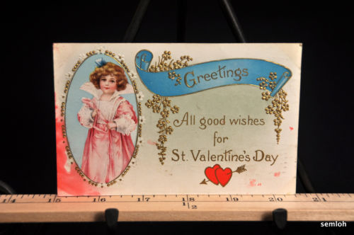 Title (ebay affiliate link): Vintage VALENTINE Embossed POSTCARD ALL GOOD WISHES Posted 1914 PINK DRESS