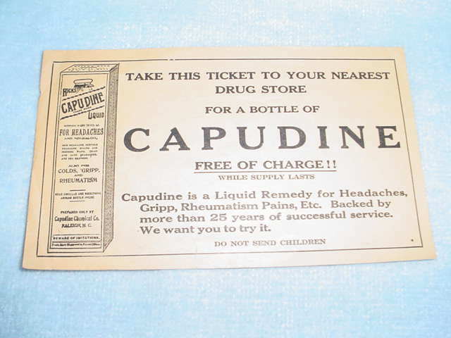Title (ebay affiliate link): CAPUDINE REMEDY - TICKET FOR FREE BOTTLE - LATE 1800, EARLY 1900 QUACK MEDICINE