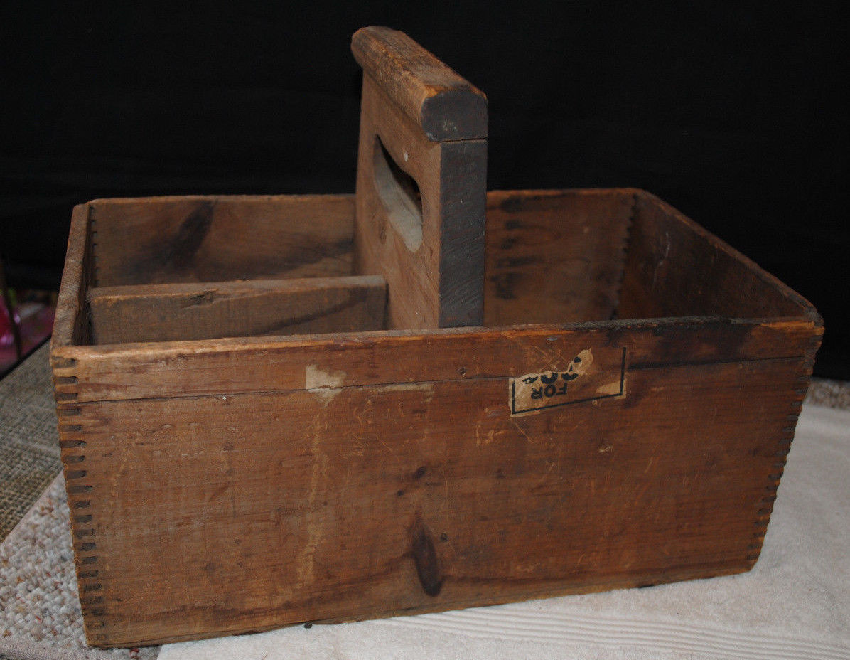 Title (ebay affiliate link): ANTIQUE PRIMITIVE WOODEN TOOL CADDY DOVETAIL WITH ADVERTISING