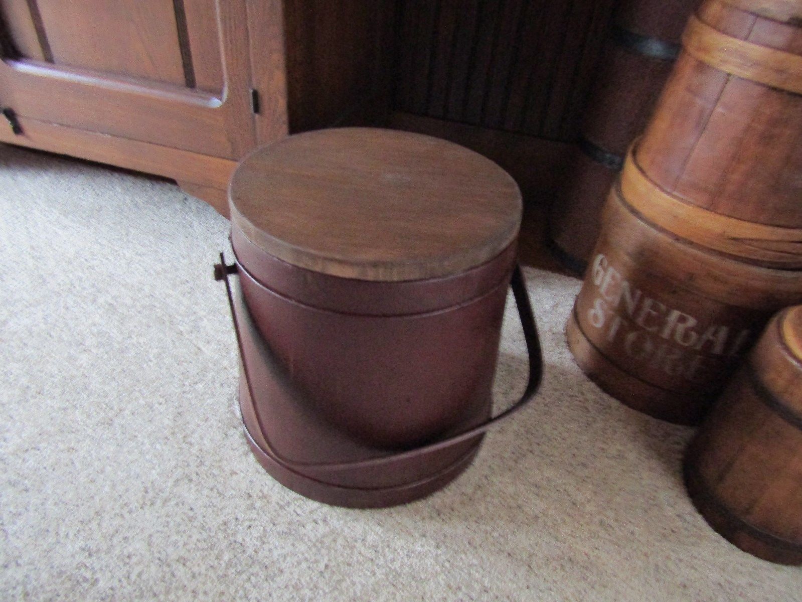 Title (ebay affiliate link): VINTAGE PRIMITIVE FIRKIN/SUGAR BUCKET WITH MAKE-DO LID-12 1/4" TALL - DK. RED