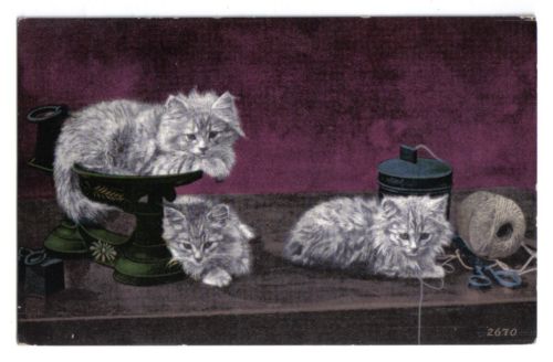 Title (ebay affiliate link): Three Cute Fuzzy Grey Kittens Sitting on Scale & Playing w/ Yarn on Desk~1907+