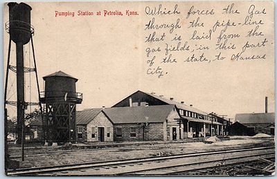 Title (ebay affiliate link): Petrolia, Kansas Postcard "Pumping Station" Water Towers Depot c1910s