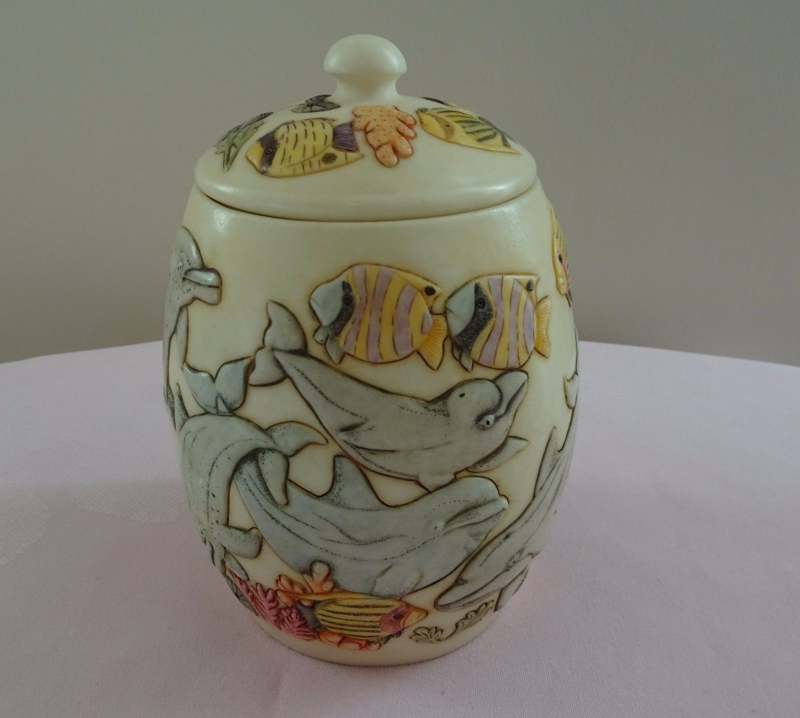 Title (ebay affiliate link): Harmony Kingdom Jardinia ''Deep Sea Divers'' Dolphins & Fish 5" Jar