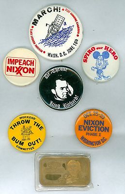 Title (ebay affiliate link): 6 Vintage 1970s Watergate & Anti-Nixon Political Pinback Buttons & 1 Medal