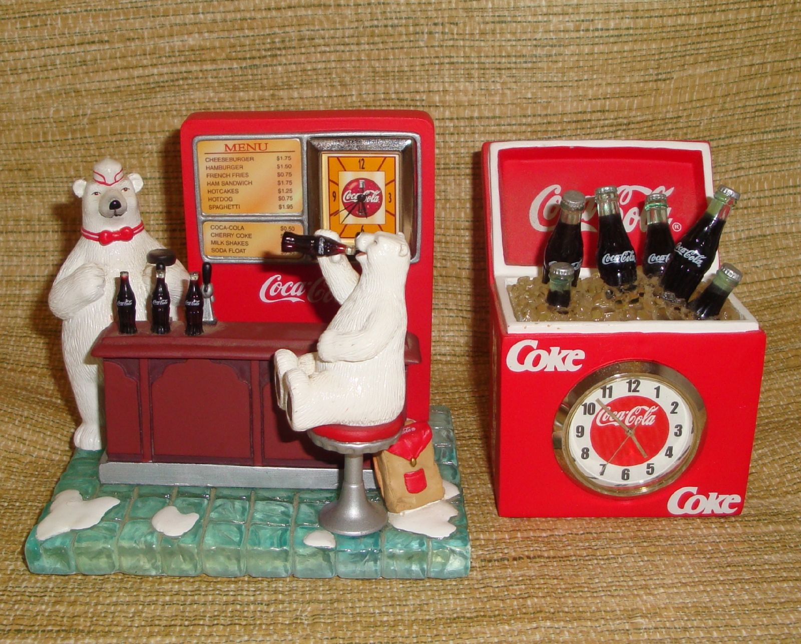 2 Tabletop Coca Cola Clocks Ice Chest Cooler and Diner with Bears
