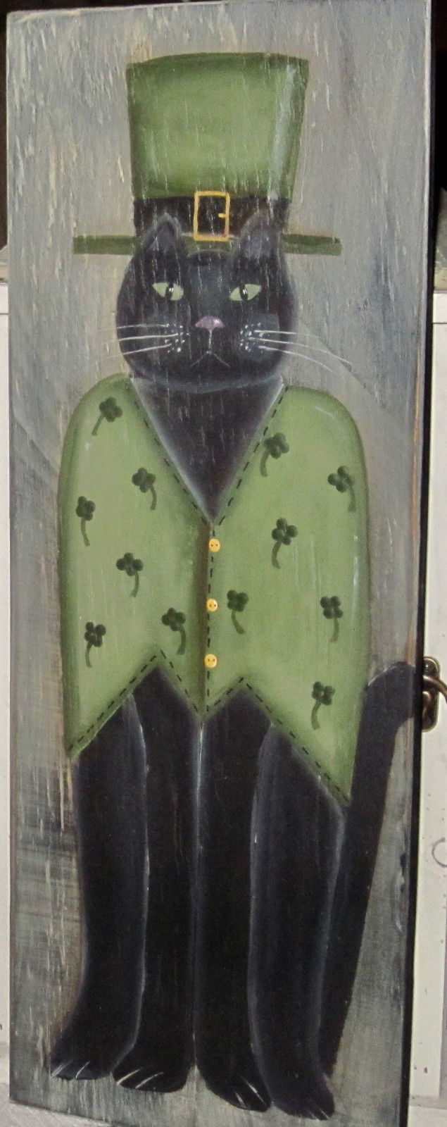 *~*PRIMITIVE*~* HP FOLK ART BLACK CAT * LEPRECHAUN * ST. PAT''S DAY *~* BOARD
