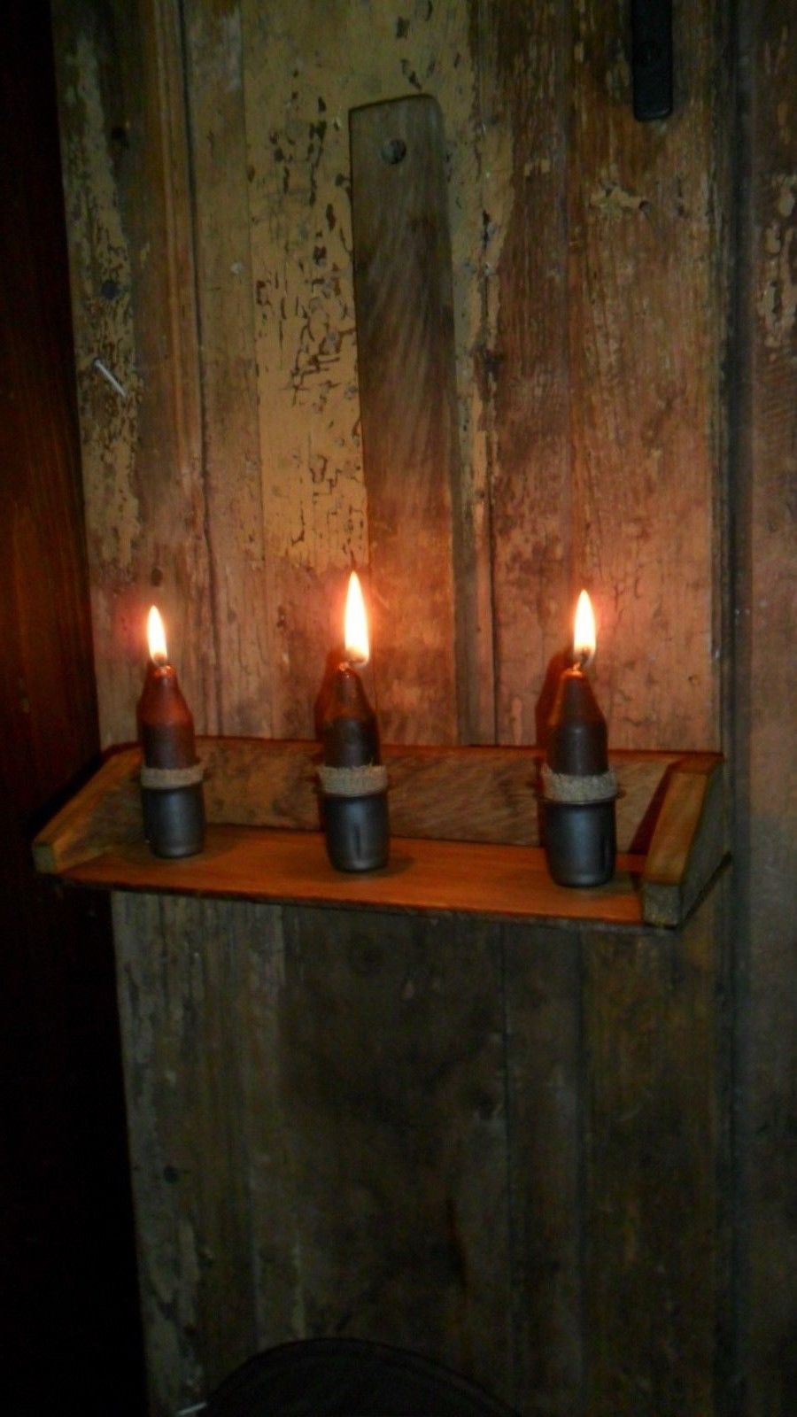 Title (ebay affiliate link): Primitive Early Look Triple Lighting, 3 Candle Stubs, Rustic Tobacco Lath Scoop