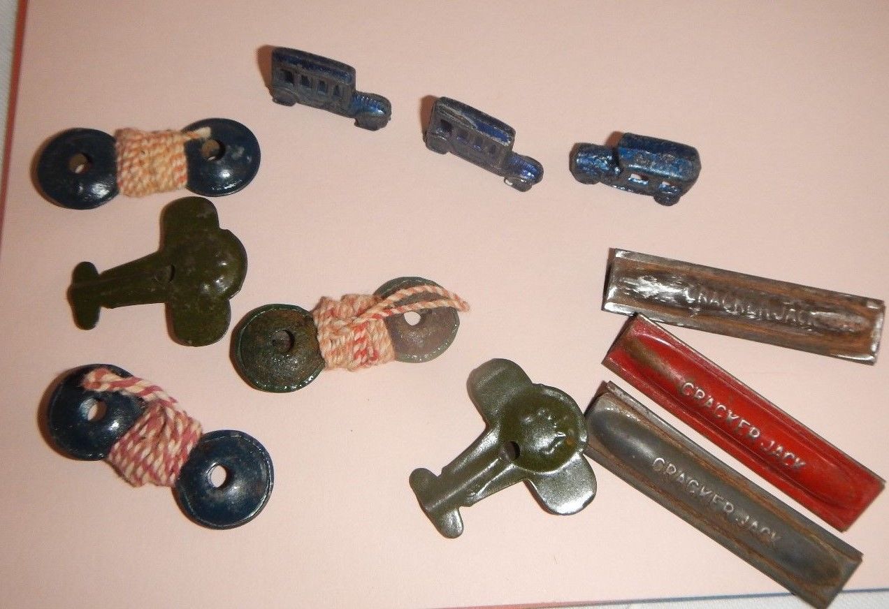 Title (ebay affiliate link): 11 pcs Tin & Metal Cracker Jack Prizes Whistles Airplane Cars