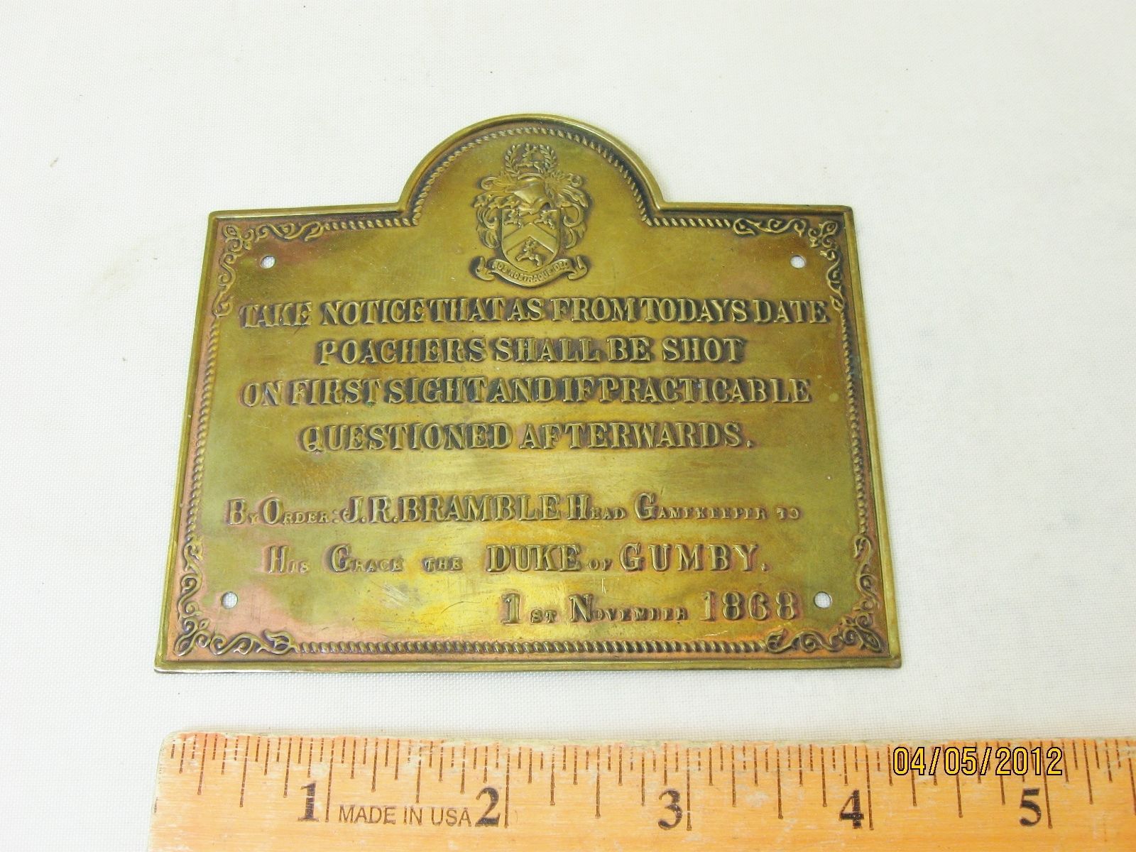 Title (ebay affiliate link): 1868 Poachers Shall Be Shot Questioned Afterwards Brass Plaque Duke Gumby Sign