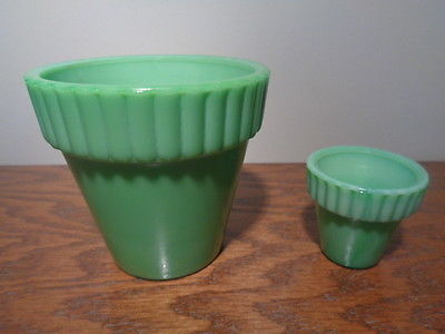 2 Vintage Akro Agate Green Marble Swirled Slag Glass Ribbed Flower Pots