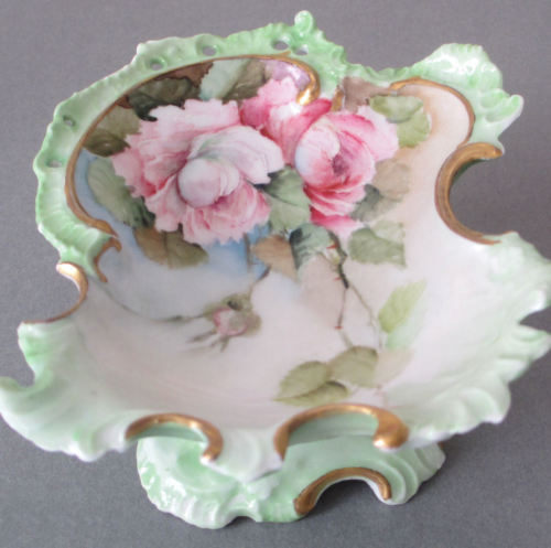 Title (ebay affiliate link): Antique Petite HandPainted Porcelain Pedestalled Dish ROSES Ornate Embossed Mold