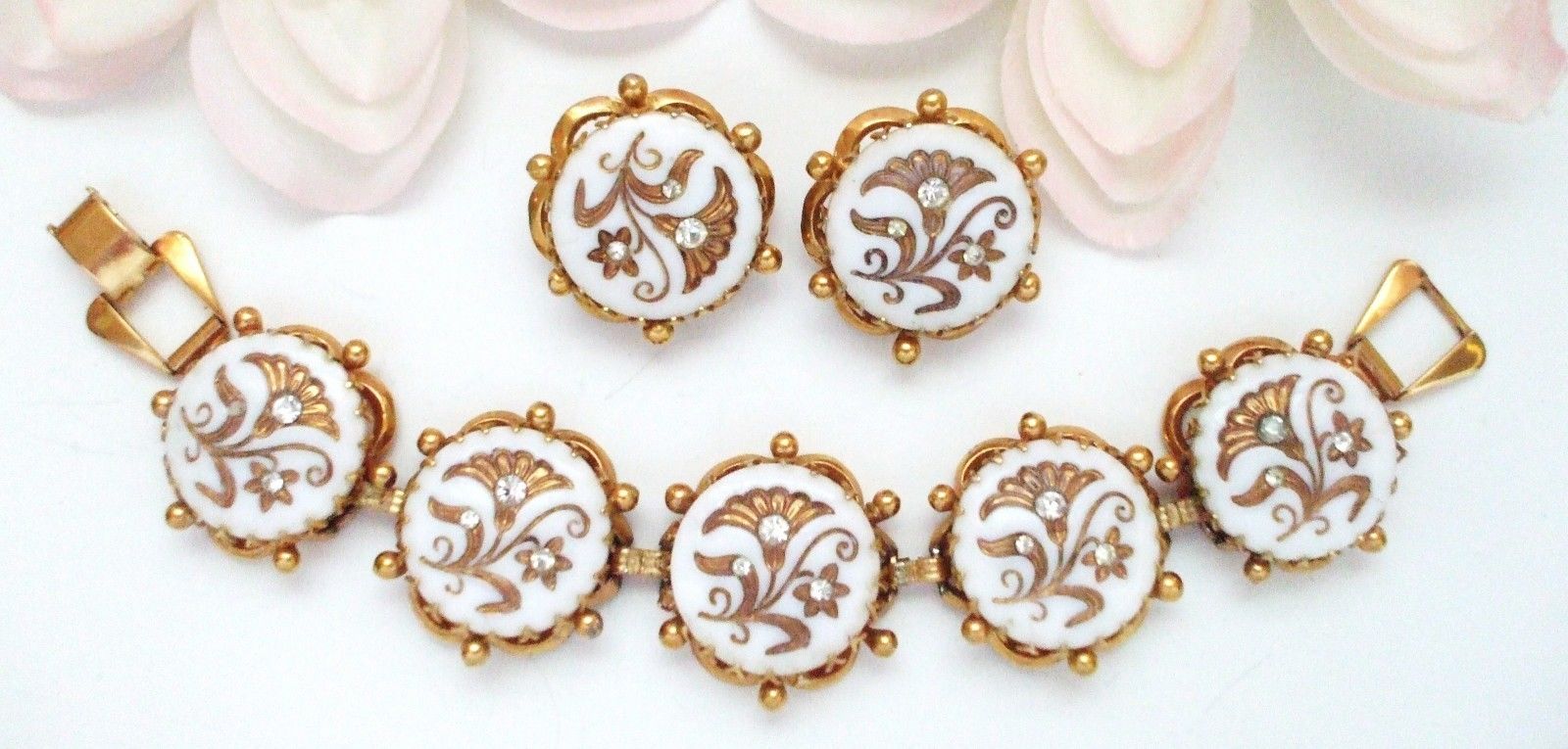 Title (ebay affiliate link): Beautiful Vintage Kramer of NY Milk Glass Bracelet & Earring Set W/Rhinestones