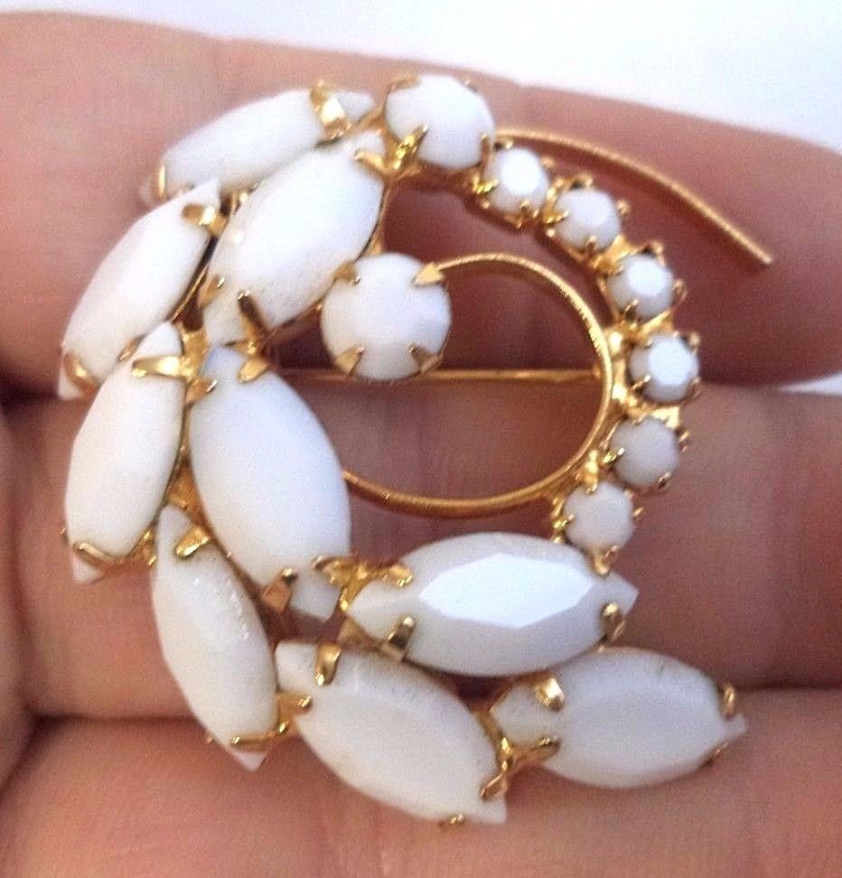 Title (ebay affiliate link): VINTAGE ESTATE HIGH END MILK GLASS RHINESTONE FLOWER 1 3/4" BROOCH!!! G2388
