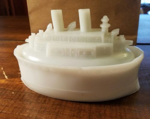 Old White Opaque Milk Glass Ship Covered Dish, Flaccus