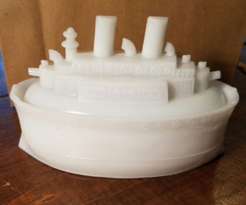 Title (ebay affiliate link): Antique Milk Glass Ship the "Olympia" 2 Piece Great Condition