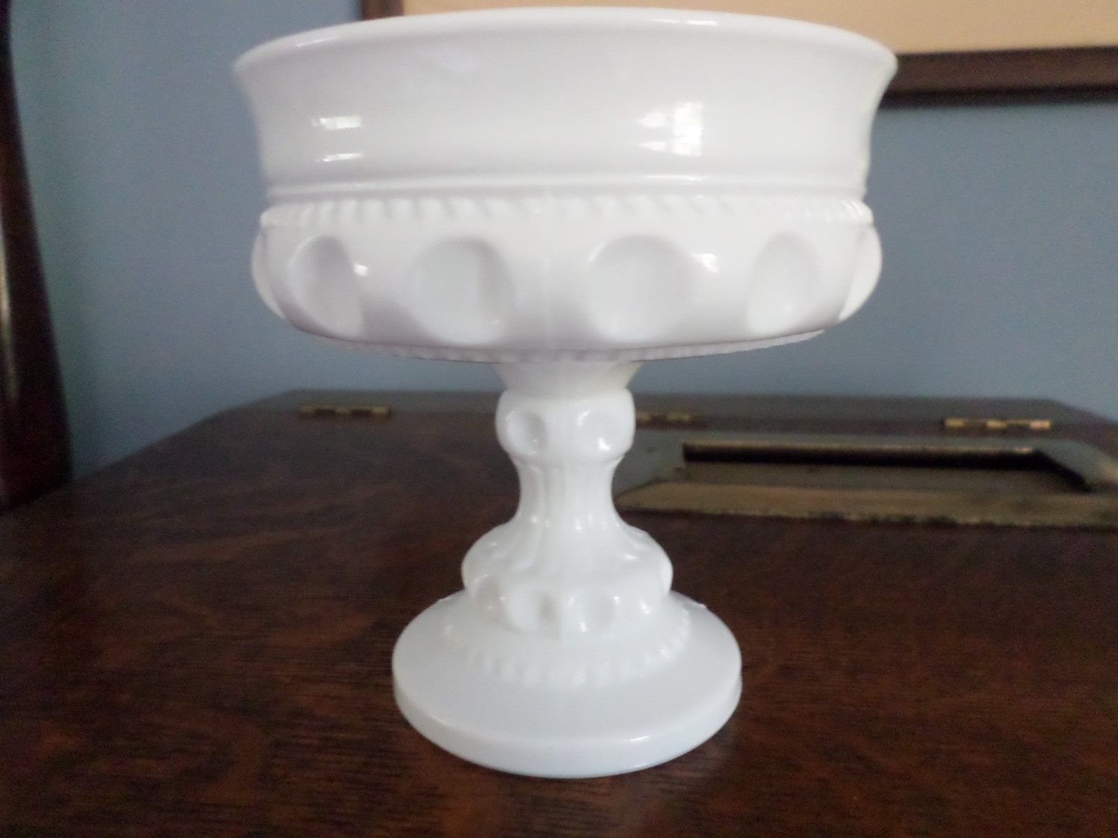 Title (ebay affiliate link): Vintage Milk Glass White Pedistal Dish with Thumb Print type Pattern Cool