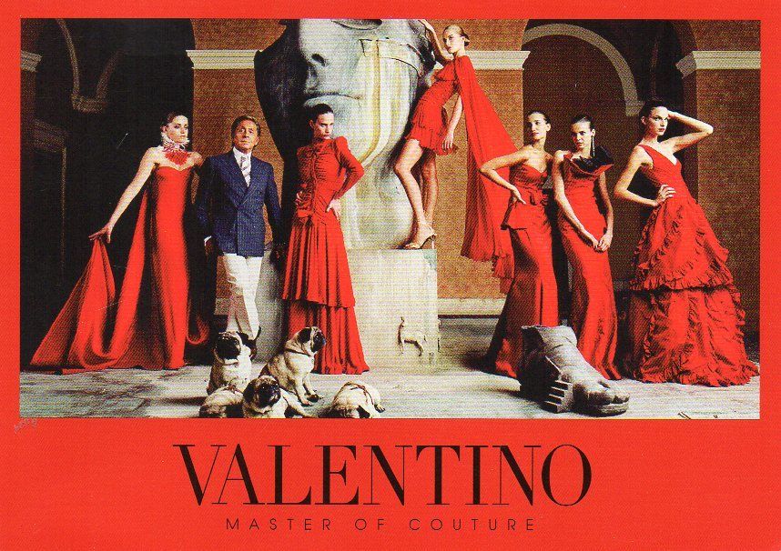 postcard of COUTURE DRESSED by VALENTINO FASHION DESIGNER pug dogs