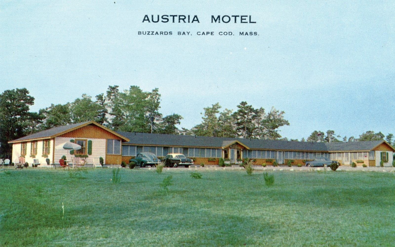Buzzards Bay, Cape Cod, MA postcard, nice 1950''s cars, Austria Motel, Rts. 6/28