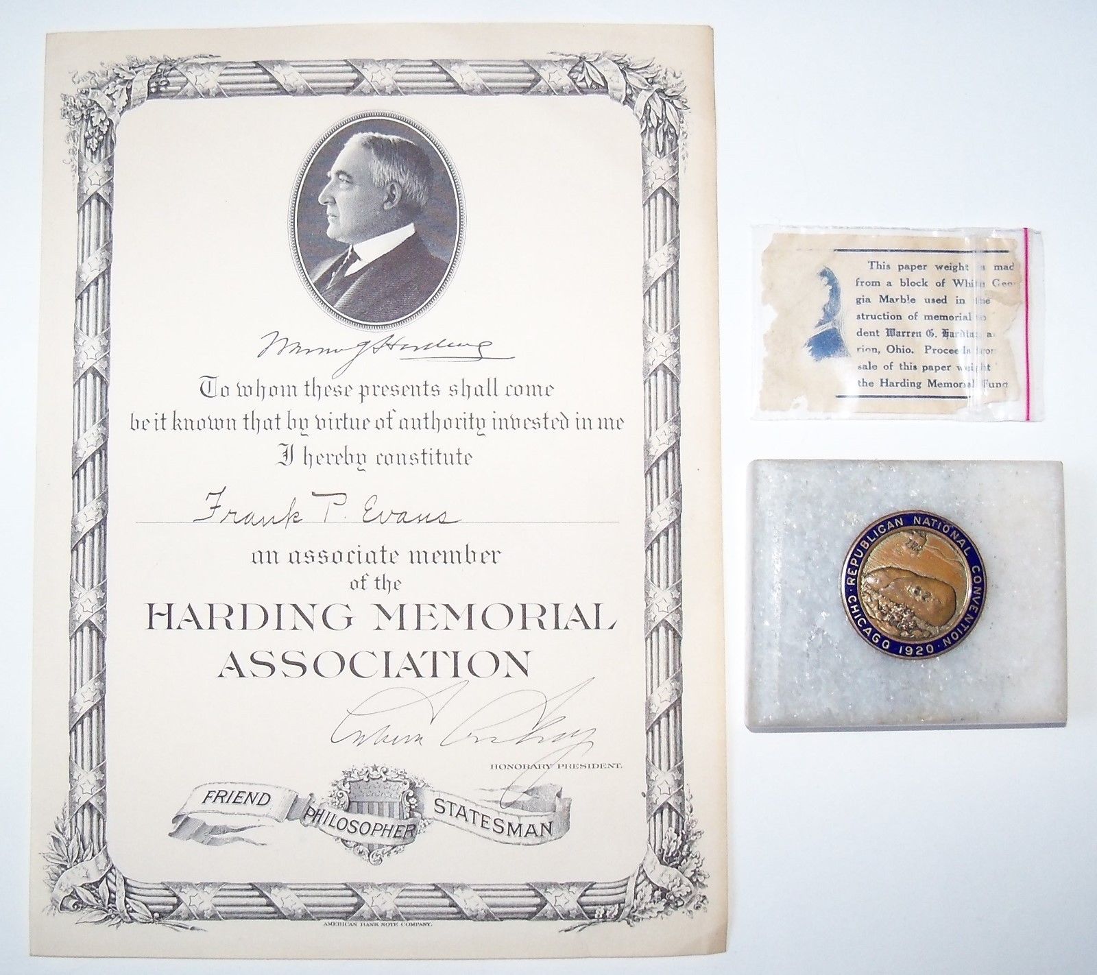Title (ebay affiliate link): Vintage Warren G Harding Memorial Association Certificate & Marble Paperweight