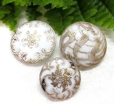 3 WHITE MILK GLASS ART NOUVEAU BUTTONS WITH DIFFERENT DESIGNS A49