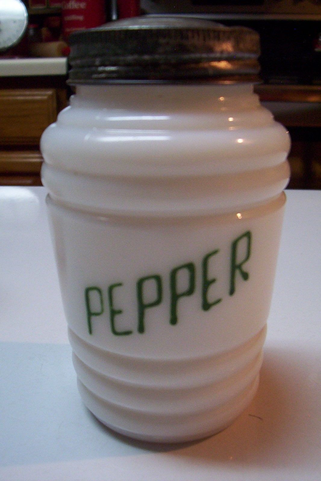 Title (ebay affiliate link): Vintage White Milk Glass Round Pepper Shaker with Green Lettering Range Set