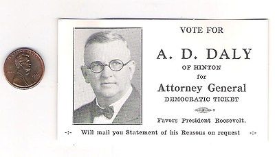 Title (ebay affiliate link): Political advertising card for Adrian Daly, Hinton WV 1936